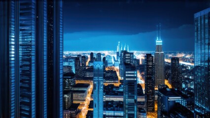 Nighttime view of a technologically advanced city with sleek, illuminated skyscrapers. Premium background for the latest technology needs