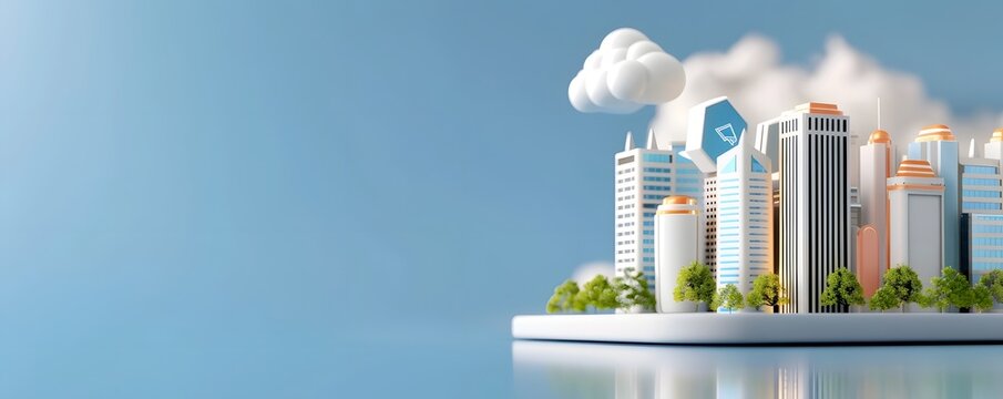 Stylized 3D rendering of a modern technologically advanced cityscape with sleek futuristic buildings digital infrastructure and a pastel colored sky