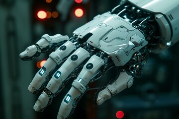 Close up of advanced robotic hand extending in technologically advanced environment