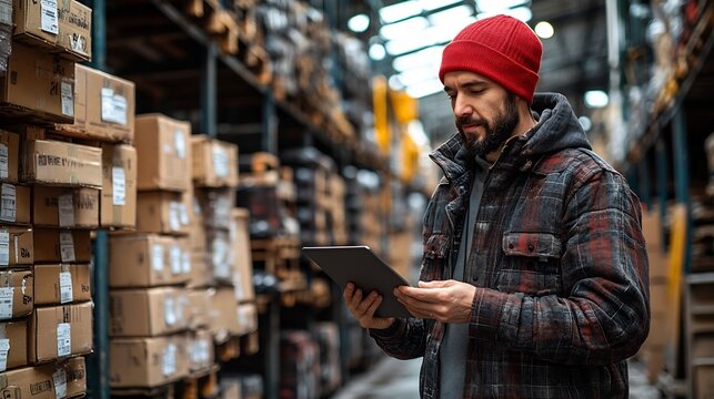 Warehouse worker scanning inventory data on touchscreen panel, wearing safety vest and cap, managing stock flow in modern distribution center logistics environment