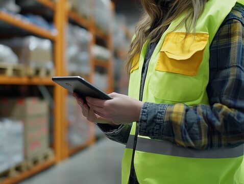 A person wearing a bright yellow safety vest looks at a tablet while standing in a warehouse filled with shelves of supplies and products. The focus is on managing inventory.
