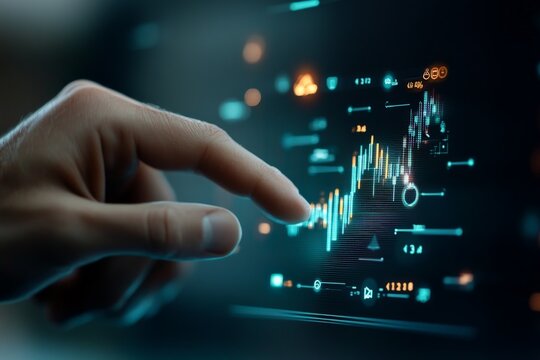 A human hand interacts with a touch screen displaying data analytics, emphasizing the role of technology and human interface in processing and interpreting complex information.