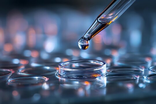 Precision pipetting in a laboratory setting with glass test plates and colorful lighting