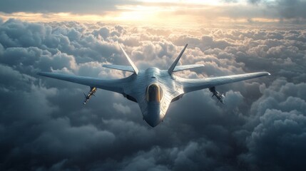 A futuristic aeroplane above the clouds at sunset symbolises progress and freedom, creating an inspiring backdrop for topics related to technology and travel.