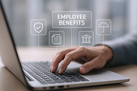 Person selects new employee benefits incentive program futuristic interface. Human resource technology with virtual icons