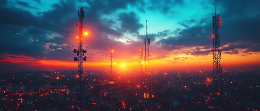 Sunset aerial view of a wireless communication tower the future of urban connectivity in digital art