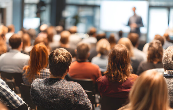 Blurred presenter addressing audience at corporate conference event. Large group of attendees listening attentively in a conference hall.
