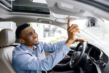 Cheerful African American man driving auto and pushing buttons on roof panel, checking car features in new vehicle, side view