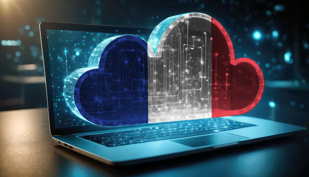 An image of a laptop with a cloud icon featuring the France flag, symbolizing the significance of cloud services in the France technology sector