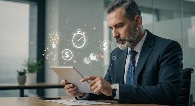 Focused businessman using a tablet with overlaid icons representing business concepts like idea, money, and time management.
