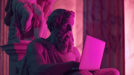 Ancient statue of Socrates illuminated by pink light while using a laptop. Concepts of technology blending with historical art and modern innovation.