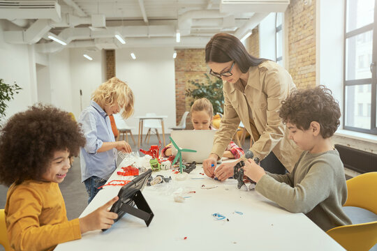 Fun and engagement. Enthusiastic kids assembling and programming robots during STEM class together with young female teacher