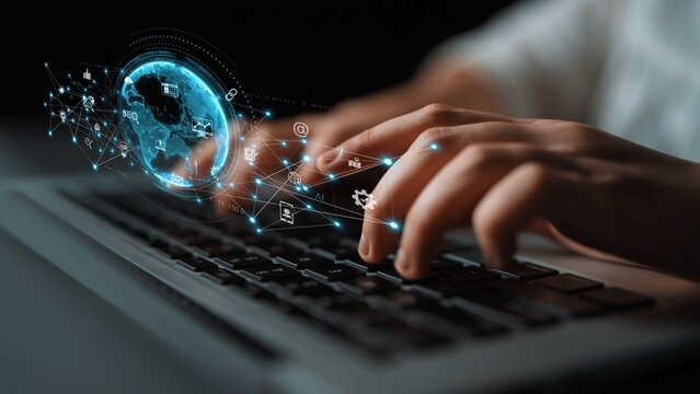 Hands Typing on Keyboard with Icons Representing Open Banking, API, and Digital Finance for Technology Integration and Innovation in Financial Services Gluon.