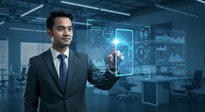 A businessman in a suit using a futuristic holographic interface in a modern office space