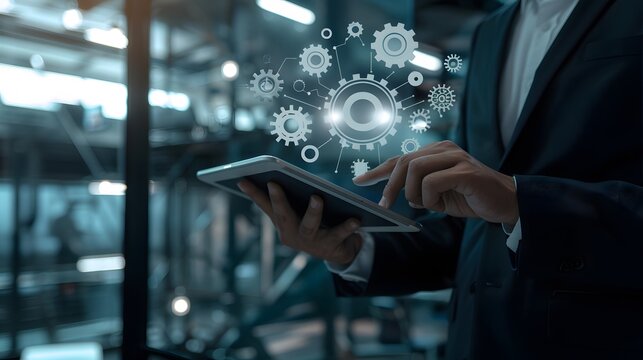 Businessman using tablet with virtual digital technology interface and gears icon for business growth
