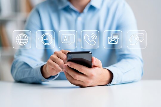 A businessman's hand touches a virtual screen button to manage a successful communication strategy and marketing plan using innovative technology