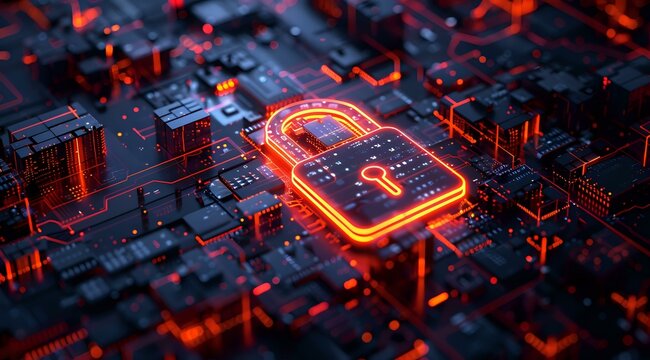 Futuristic digital security concept with glowing lock icon on a circuit board, ideal for technology presentations, cybersecurity articles, and IT solutions.