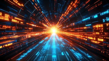Showing abstract network in virtual space, with glowing lines, nodes, code panels and data points