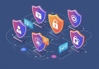 Cybersecurity shield protecting data with vibrant neon lights in the digital city, symbolizing online safety and security, offering peace of mind in the digital age
