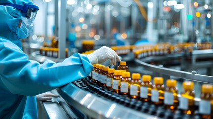 Factory operators in sterile manufacturing working with pharmaceutical machinery and technology