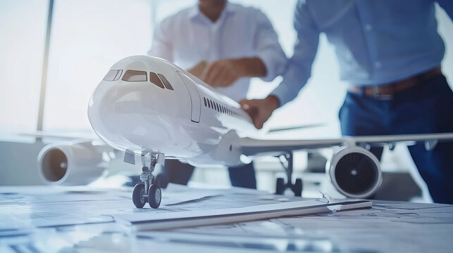 Team of Engineers Collaborating on Innovative Aircraft Design with Scale Model and Blueprints