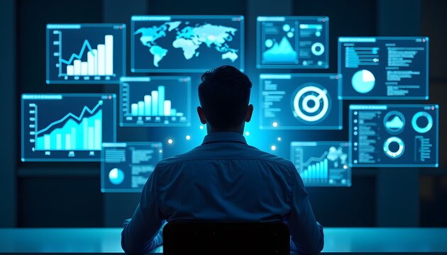Focused data analyst monitors global trends. Multiple screens display maps graphs, data visualizations. Pro in headset concentrates on analysis. Modern tech in office workspace. Trendy analysis, tech
