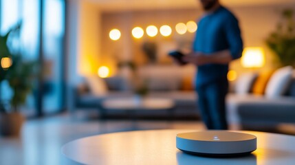 Closeup of a house sitter setting up a security system, with focus on modern technology and a cozy living room in the background