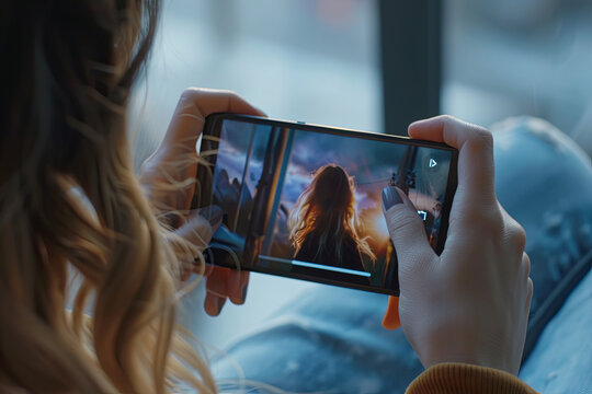 Woman stopping a film on a mobile phone with an imaginary video player, concept of online video streaming