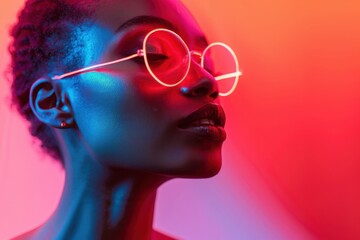 Black woman with futuristic eyewear against a vibrant neon backdrop