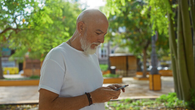 Mature bald man with a grey beard using a smartphone in an outdoor urban park on a sunny day.