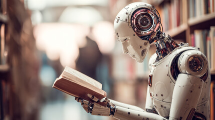 Humanoid robot reading a book in a library
