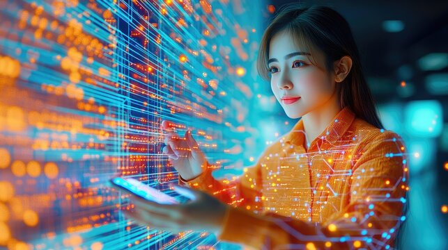 A young woman interacts with a digital display, showcasing technology and innovation in a vibrant and futuristic setting.