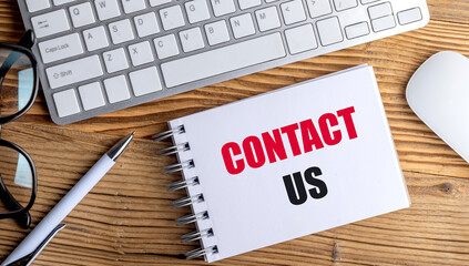 Text CONTACT US on a spiral notebook placed on a wooden desk, surrounded by a keyboard, pen, eyeglasses, and a wireless mouse.