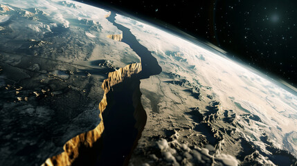 Earth, seen from a distance, features a prominent crack, underscoring the contrast between the serenity of space and the turmoil on the planet's surface.
