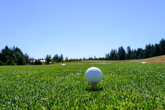 Closeup of golf ball teed up, scenic landscape in the background, recreation on a sunny summer day