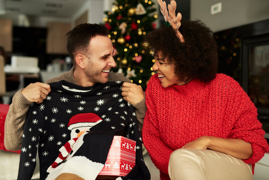 lovers cuddle in christmas interior