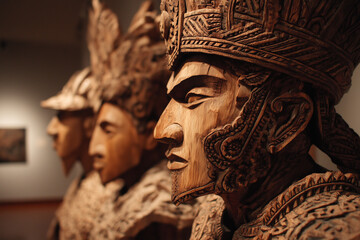 Exhibition of traditional Indonesian sculpture in the cultural gallery, highly detailed carved wooden statues, ethnic motifs typical of the archipelago.