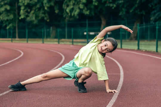 Child training at school physical lesson, teenage girl stretching outdoors.