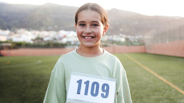 Child running on stadium. Kid exercising in athletics. Young athlete in race competition. Healthy outdoor sport for kids. Children run. Young teen boy running on the running track at stadium outdoors
