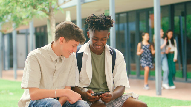 Group of multiracial teen college friends having fun outdoors. Happy people taking selfie.