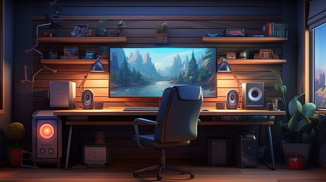 Young 3D designer creates video game character or clothes, works remotely from home on computer and big digital screen with professional software interface and tools for 3D modeling and design.