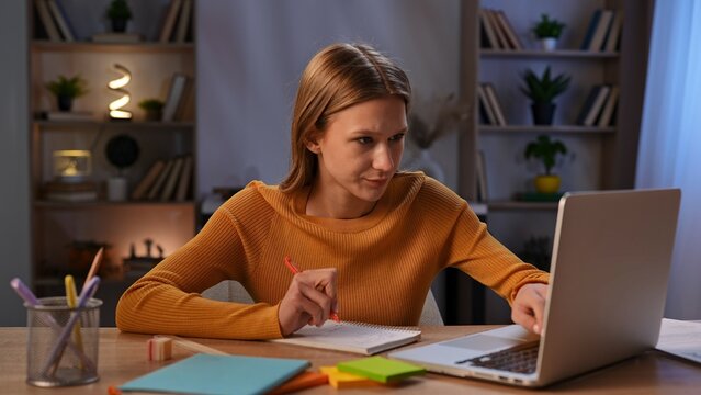 Focused Woman Studying While Using a Laptop and Notepad at Desk