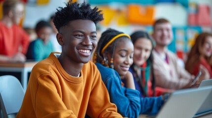 Teen students collaborating on laptop in classroom during group learning session