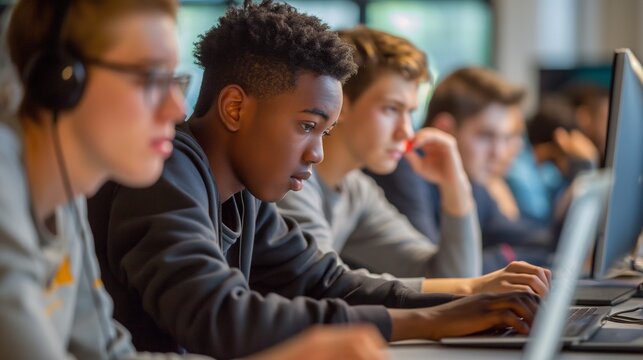 A diverse team of high school students concentrates on coding project, the integration of technology in education, the benefits of collaborative learning in developing critical skills for the future
