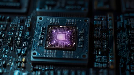 Detailed close-up view of central processor unit microchip glowing brightly on complex dark electronic circuit board. Technology concept