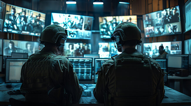In the central office, Control and Monitoring for managing national security, military surveillance officers use computer screens. Generative AI.