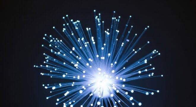 Bright blue fiber optic cables glow, radiating light from a central source against dark