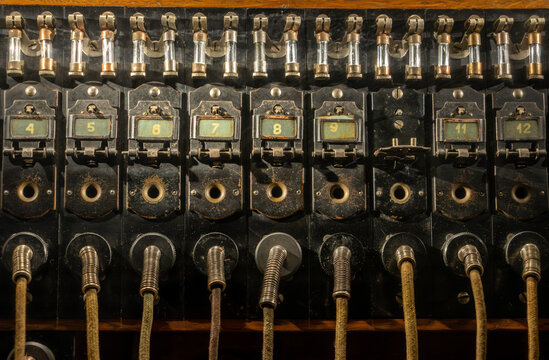 Glowing vintage telephone switchboard featuring brass plugs and coiled cords