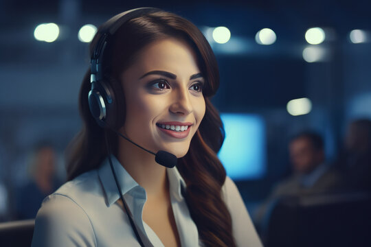 A woman with headphones on her head sitting in a call center. Smiling call center employee. generative ai