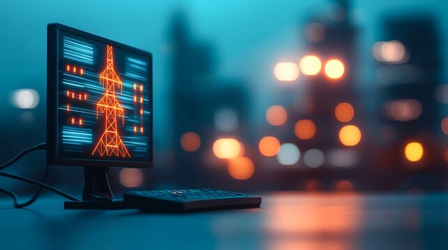 Abstract telecommunications tower in urban nightscape with glowing lights and data visualization elements representing digital connectivity and technology growth
